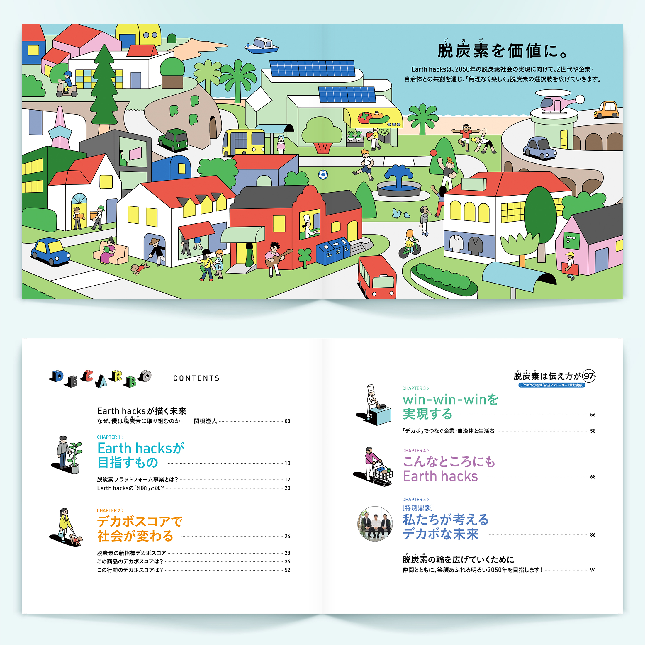 表紙や扉絵が、各章の扉に転用できるイラスト設計でのご依頼でした。 ラフでは1枚絵でありつつ、各場面を盛り込んだ案と、 各場面の要素で絵文字にした案を作りました。 . illustration for book about Decarbonization.